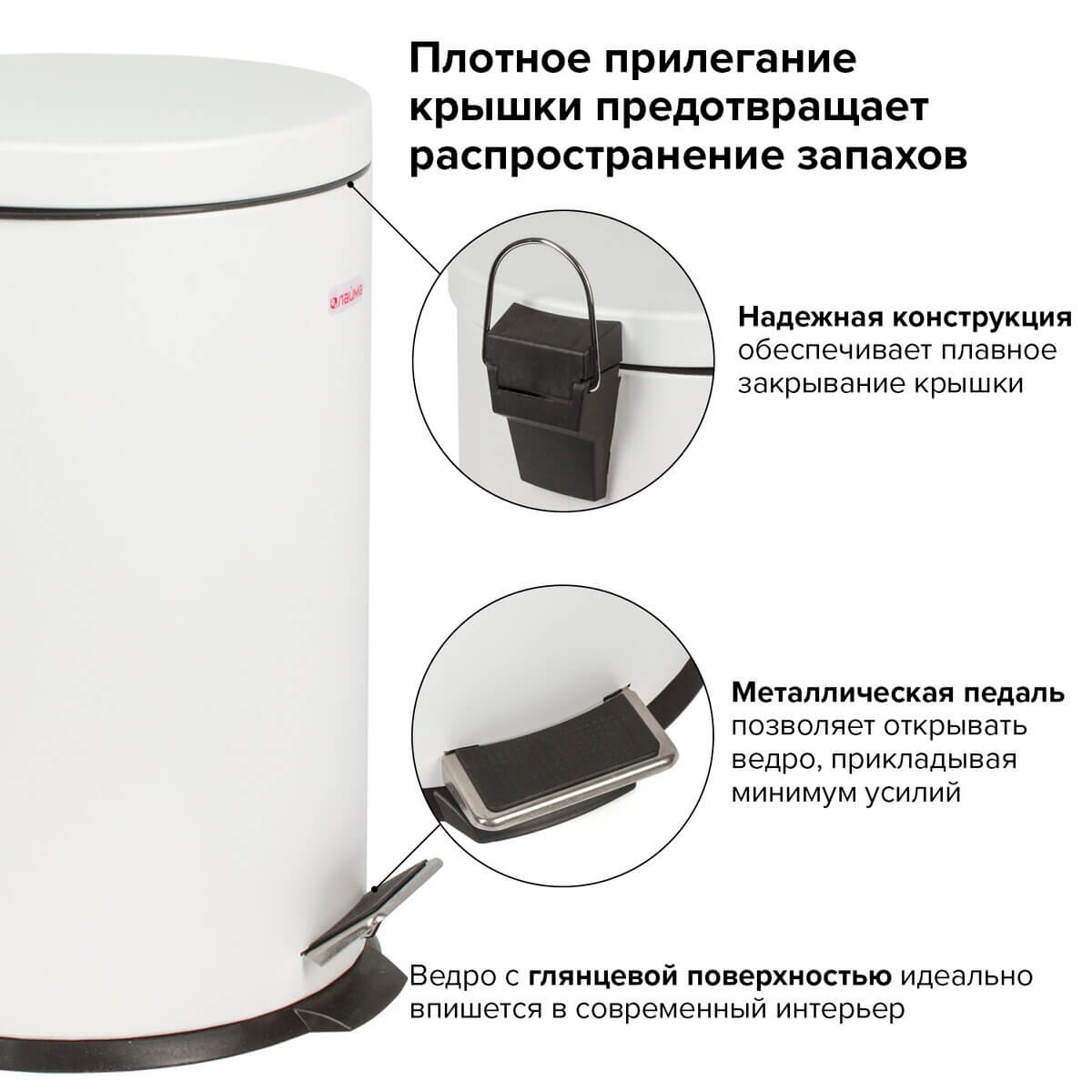 Рекомендуемый объем мешка - 30 литров. Белый цвет с глянцевым покрытием придает контейнеру эстетичный вид. Его компактные размеры (45х29,2х29,2 см) гармонично впишутся в любой интерьер.
